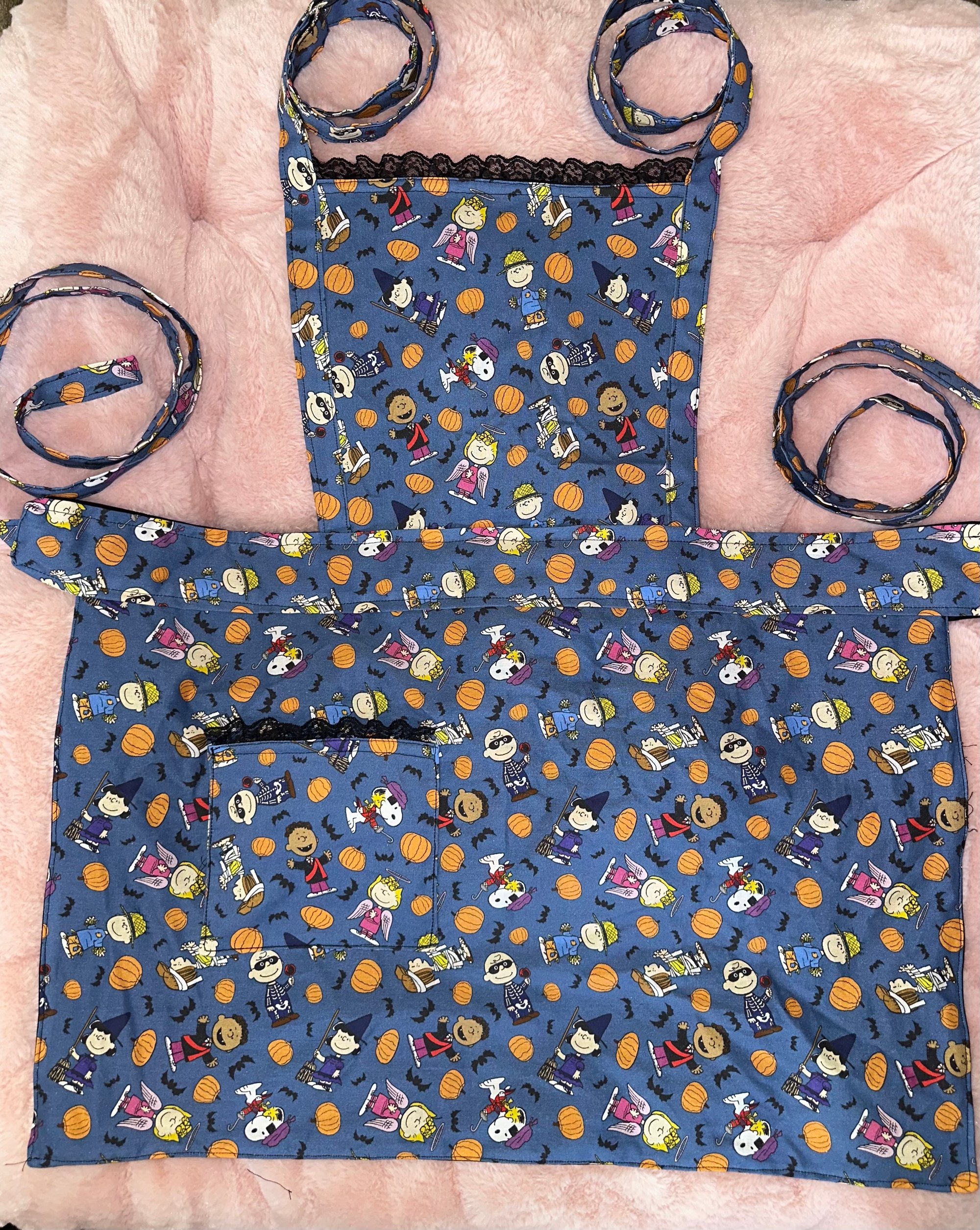 This apron is one size fits all! It has a tie for the neck and waist strap so it’s very adjustable! Finished off with cute black lace you’re sure to impress any spooky guest .