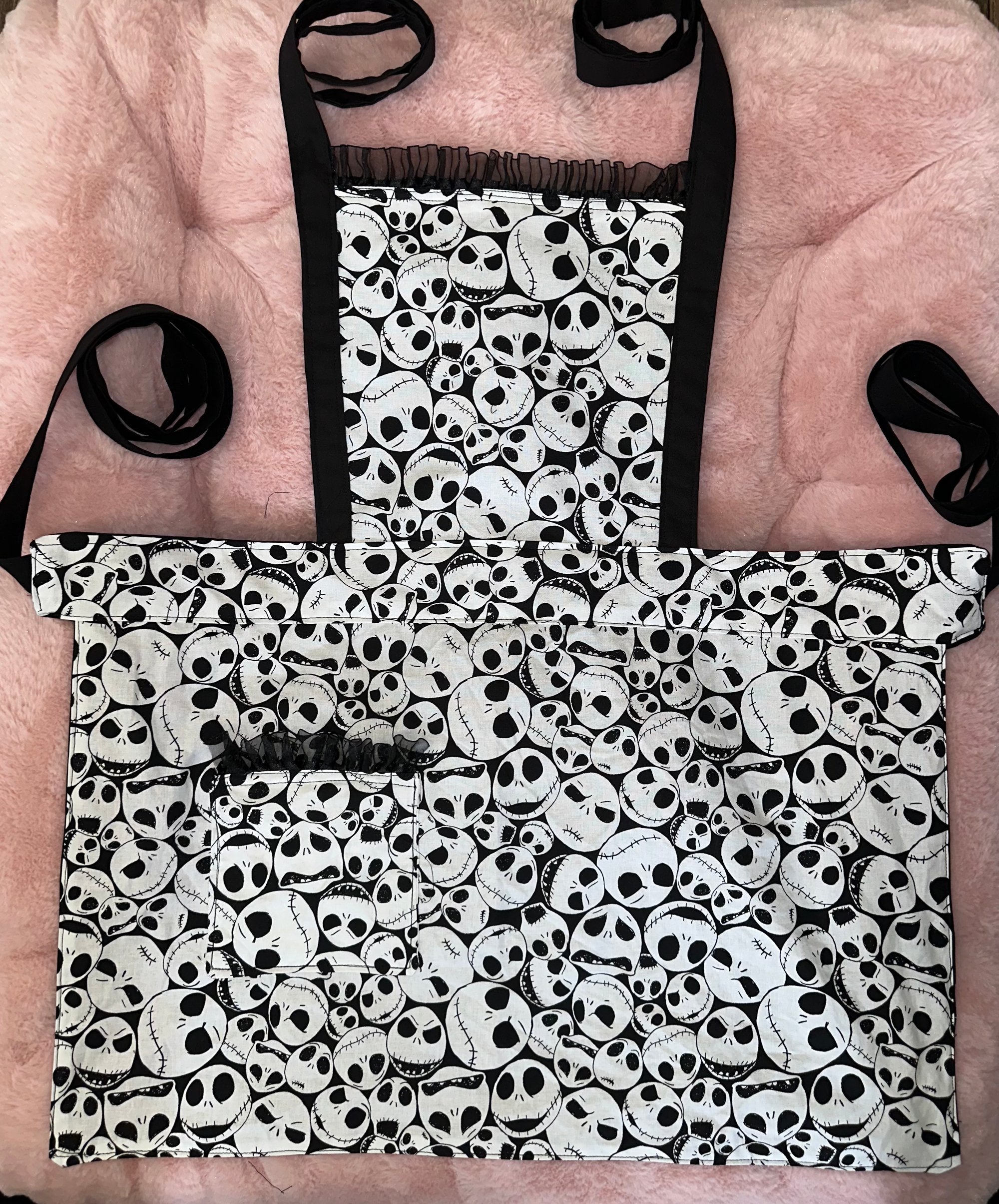 This apron is one size fits all! It has a tie for the neck and waist strap so it’s very adjustable!this is a great apron for year round usage but especially during Halloween and Christmas!
